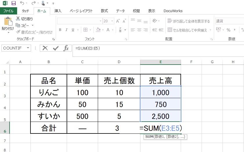 りんご、みかん、すいかの売上高の合計を算出したい場合、