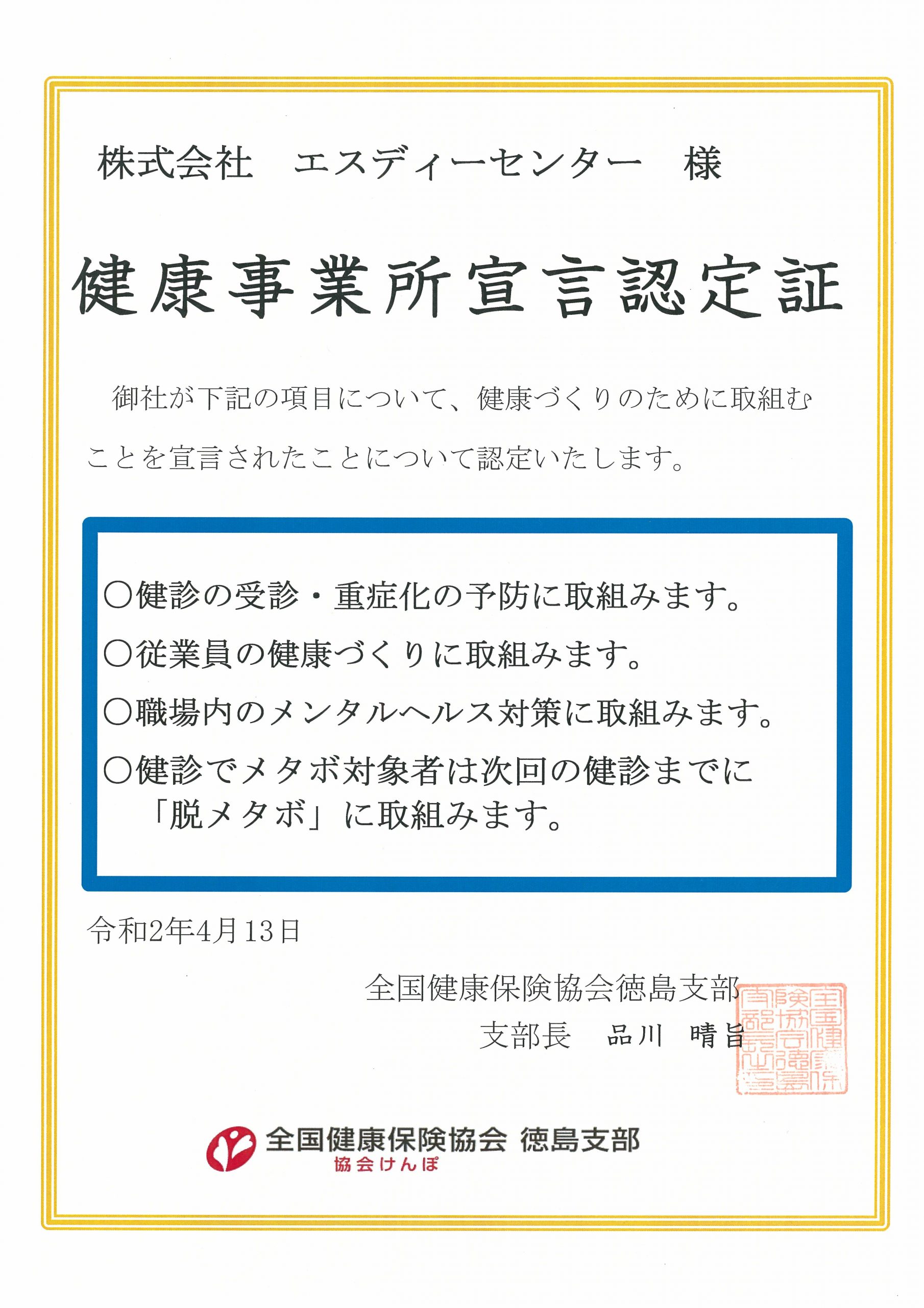 株式会社エスディーセンターは、全国健康保険協会 徳島支部から【健康事業所宣言】に認定されています。