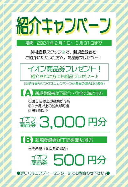 弊社登録スタッフで、新規登録者をご紹介いただいた方にイオン商品券プレゼント!