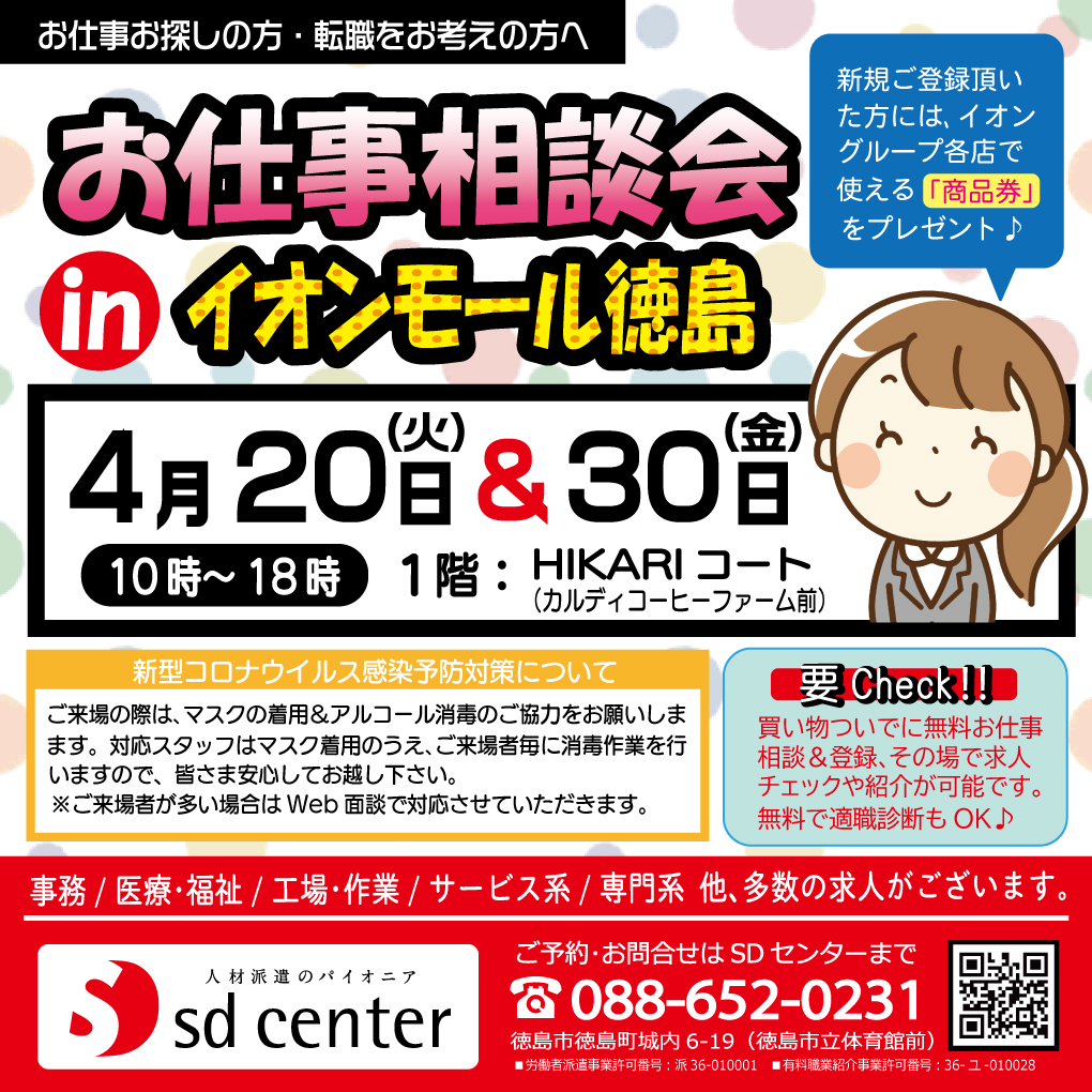 4/20、30「お仕事相談会inイオンモール徳島」開催!